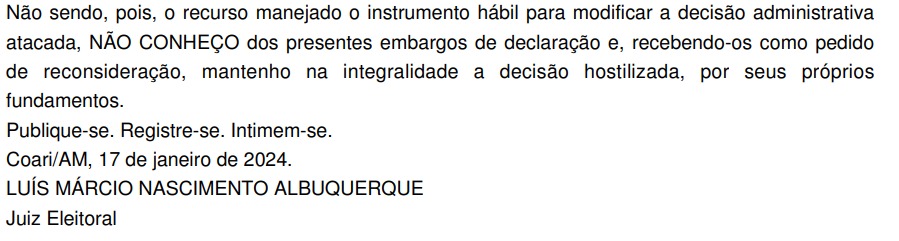 “Não sendo, pois, o recurso manejado o instrumento hábil para modificar a decisão administrativa atacada, NÃO CONHEÇO dos presentes embargos de declaração e, recebendo-os como pedido de reconsideração, mantenho na integralidade a decisão hostilizada, por seus próprios fundamentos”, diz trecho do documento.