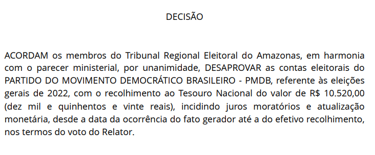 MANAUS (AM) – O Tribunal Regional Eleitoral do Amazonas (TRE-AM) reprovou a prestação de contas das eleições gerais de 2022 do Diretório Estadual do Movimento Democrático Brasileiro no Amazonas (MDB/AM), presidido pelo senador Eduardo Braga.