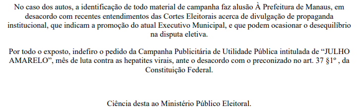 A decisão é do juiz Roberto dos Santos Taketomi da 32ª Zona Eleitoral do TRE-AM. O magistrado entendeu que a realização da campanha resultaria em descumprimento de entendimentos recentes das Cortes Eleitorais que tratam da divulgação de propaganda institucional. Na sentença, o juiz aponta que a publicidade viola o artigo 37, inciso 1° da Constituição de 1988.