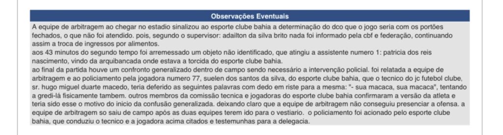 A confusão e a denúncia de racismo também foi registrada em súmula. De acordo com o documento oficial da partida, a própria zagueira relatou à equipe de arbitragem e ao policiamento que Hugo Duarte cometeu injúria racial e tentou agredi-la fisicamente. Ainda segundo a súmula assinada pela árbitra Jady Jesus Caldas, membros da comissão técnica e jogadoras Bahia confirmaram a versão da atleta, mas a arbitragem não conseguiu presenciar as ofensas.