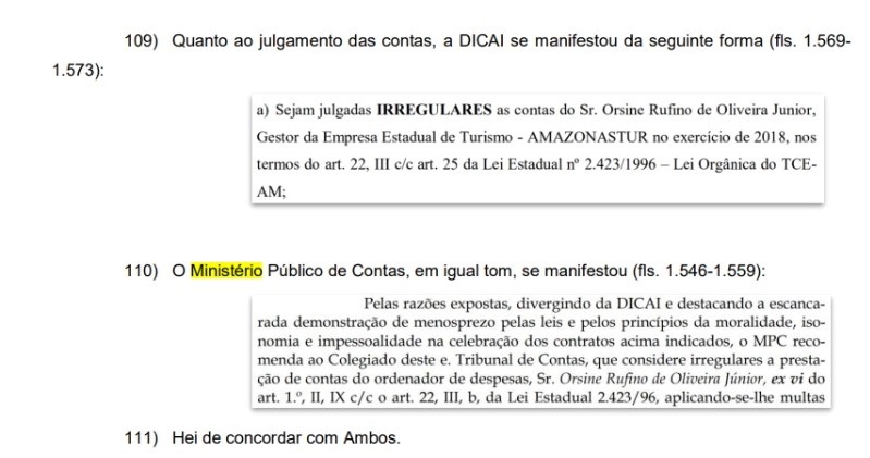 BRASÍLIA – O Tribunal de Contas do Estado do Amazonas (TCE-AM) julgou irregular a prestação de contas do ex-presidente da Empresa Estadual de Turismo do Amazonas (Amazonastur), Orsine Junior, referente a 2018, e determinou a aplicação de multas que somam R$ 392.333,91. A alegação do auditor Luiz Henrique Pereira Mendes é de que Orsine cometeu improbidade administrativa, ato realizado por agente público que fere os princípios administrativos determinados pela Constituição.
