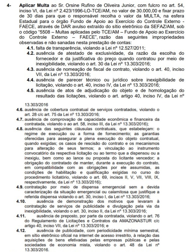 Em nota, Orsine Júnior afirmou que vai recorrer da multa aplicada pelo Tribunal de Contas do Estado do Amazonas (TCE-AM), solicitando a suspensão. Ele alega ainda que as ações na gestão à frente da Amazonastur “foram realizadas dentro dos princípios da legalidade” e que em nenhum momento foi notificado da sessão de julgamento pelo TCE-AM para fazer sustentação oral no processo.