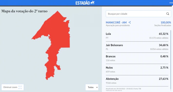 MANAUS – É falso o conteúdo de vídeo que circula no WhatsApp e em outras redes sociais sobre uma suposta fraude nas eleições presidenciais em Manicoré (AM), cidade a 330 km de Manaus. Uma mulher afirma que o presidente Jair Bolsonaro (PL) não teve nenhum voto na cidade, apesar de ter vários apoiadores no local. No entanto, Bolsonaro recebeu 8.056 votos no 2º turno das eleições no município, como mostra a página de apuração do Estadão. O presidente eleito Luiz Inácio Lula da Silva (PT) teve 65,32% dos votos, contra 34,68% do adversário.