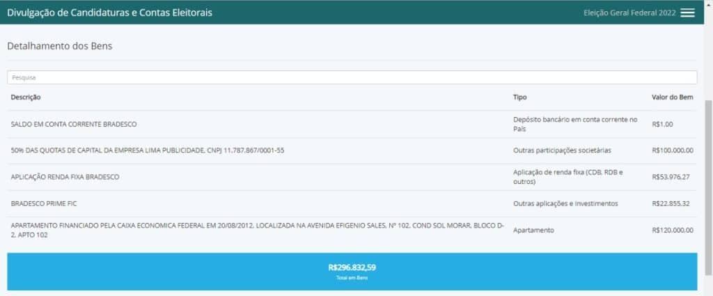 O senador foi o candidato ao Governo do Estado que mais declarou bens ao TSE, no total foram R$ 35.789.885,79, entre terrenos, embarcações, apartamentos, casa, veículos, aplicações e depósitos bancários. Um valor é superior em R$ 4 milhões, ao que foi declarado por ele em 2018, quando foi eleito ao Senado Federal.