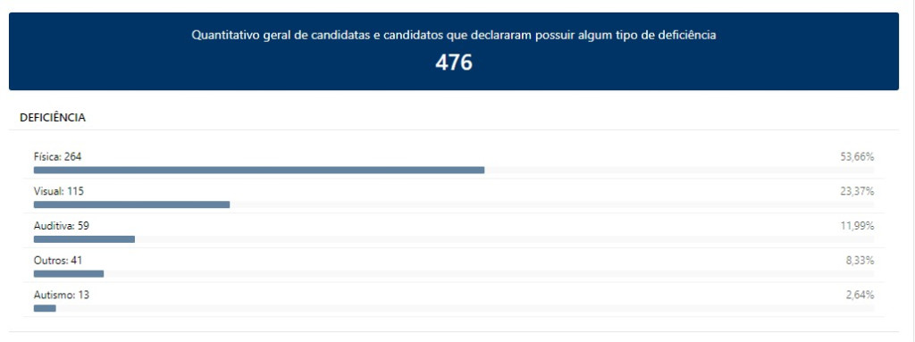 Segundo os dados do TSE, 264 candidatos possuem alguma deficiência física, o que corresponde a (53,66%). Os que apresentam deficiência visual somam 115 registros (23,58%) e auditiva 59, o que equivale a (11,58%). Outras deficiências e autismo completam com (8,33%) e (2,64%) respectivamente.