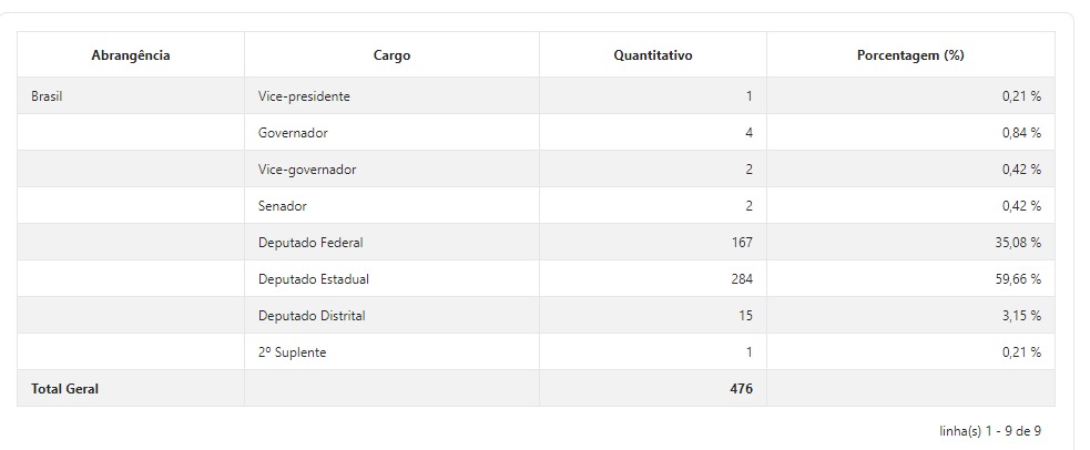 No pleito deste ano, os candidatos integram em 28 dos 32 partidos que participam da eleição, sendo o PSB com maior quantitativo de 46 candidaturas, seguido do PT com 32, PL com 31, PSOL e Solidariedade com 27, Podemos com 24 e MDB com 22 postulantes registrados.