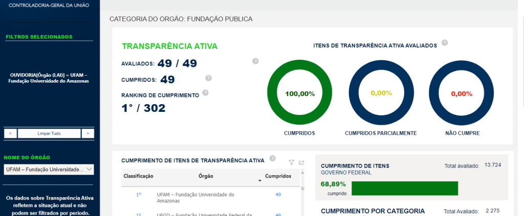 MANAUS – A Universidade Federal do Amazonas (Ufam), na última sexta-feira, 29 de setembro, alcançou a primeira colocação no ranking de Transparência Ativa da Controladoria Geral da União (CGU). A Universidade cumpriu todos os 49 requisitos exigidos pela CGU, entre eles “Ações e Programas”, “Dados Abertos”, “Receitas e Despesas” e “Serviço de Informação ao Cidadão (SIC)”, e ficou entre as nove universidades federais a alcançar essa marca em um universo de 302 órgãos federais.