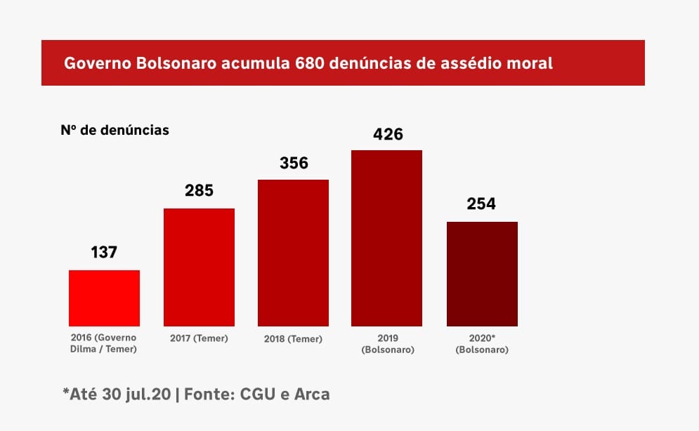 Conforme apuração da Folha de São Paulo, sob a gestão do presidente Jair Bolsonaro (sem partido) os índices de denúncias cresceram de janeiro a julho deste ano. Por exemplo, foram 254 relatos registrados. Em todo o ano passado, 426, um avanço de 20% em relação aos 356 casos registrados em 2018 e de 49% ante os 285 em 2017, ambos sob a gestão de Michel Temer (MDB).