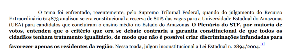 Na decisão, a situação da constitucionalidade de 80% das vagas da Universidade Estadual do Amazonas (UEA) para candidatos que concluíram o ensino médio no estado foi citada como exemplo de julgamento pelo Supremo Tribunal Federal (STF).