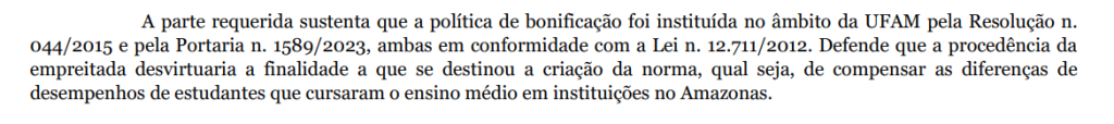 De acordo com a juíza, a Portaria n. 1589/2023, que trata da bonificação, foi considerada irracional e discriminatória, apontando que a garantia do direito está presente na Carta Magna. Além disso, também ressaltou que a demora no resultado do processo prejudica o acesso ao ensino superior.