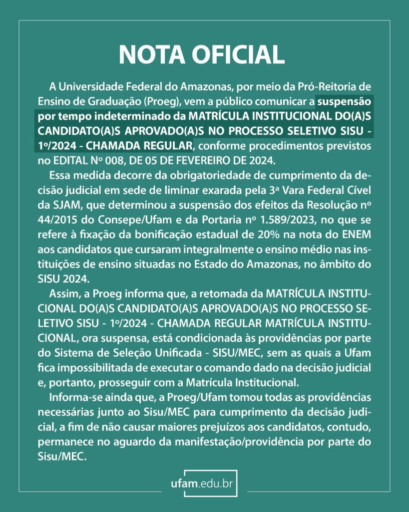 Em nota, a Ufam, por meio da Pró-Reitoria de Ensino de Graduação (Proeg), informou que tomou todas as providências necessárias junto ao Sisu/MEC para cumprimento da decisão judicial, a fim de não causar maiores prejuízos aos candidatos. Na manhã desta quarta-feira, 28, o Conselho Universitário da Ufam (Consuni) se reuniu para discutir a suspensão das matrículas.
