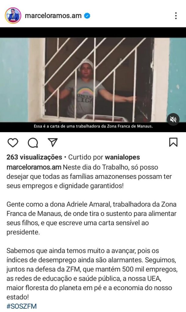 “Neste dia do Trabalho, só posso desejar que todas as famílias amazonenses possam ter seus empregos e dignidade garantidos!” disse o deputado. No vídeo, Ramos também lembra que não só os trabalhadores de produção podem perder seus empregos, mas as pessoas que estão ligadas ao polo indiretamente.