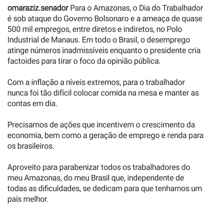 “Hoje [1° de Maio], não é um dia de comemoração para os trabalhadores amazonenses, é um dia de luta, de reivindicar uma mudança de política no governo federal”. Ele ainda afirma que “Bolsonaro é inimigo do trabalhador amazonense”.