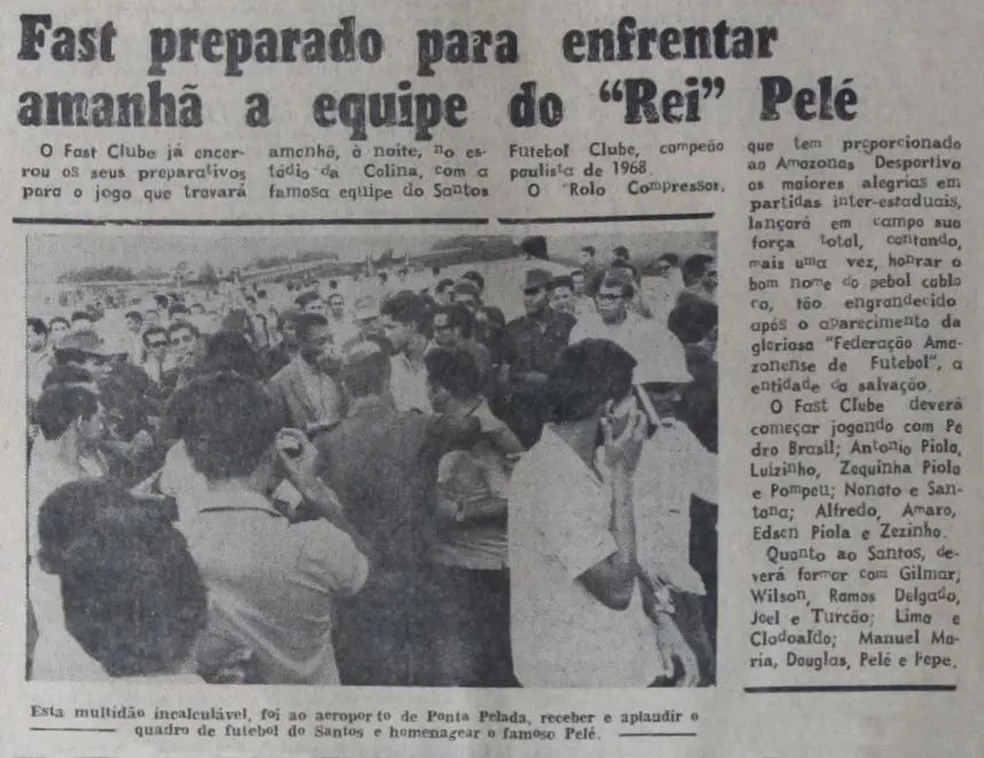 A primeira vez de Pelé, em Manaus, foi em 9 de agosto de 1968. O jogo era um amistoso contra o Nacional Fast Clube. A partida aconteceu no Estádio da Colina, completamente lotado para ver o “Rei do Futebol”. O placar foi de 3 a 0 para o Santos, com um gol de Pelé. A segunda partida, também amistosa, foi no dia 11 de agosto de 1968 contra o Nacional Futebol Clube. Na ocasião, o “Naça” foi derrotado por 2 a 1, com direito a um gol de Pelé.