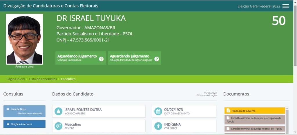 MANAUS – O único entre os oito candidatos a governador do Amazonas, nas eleições 2022, que declarou não ter bens ao registrar a candidatura no Tribunal Superior Eleitoral (TSE), o indígena Israel Tuyuka (Psol) defende as causas das minorias e a classe trabalhadora em seu plano de governo. O postulante concorre um cargo político pela primeira vez desde 2004, quando tentou a vaga de vice-prefeito de São Gabriel da Cachoeira (a 852 quilômetros de Manaus).