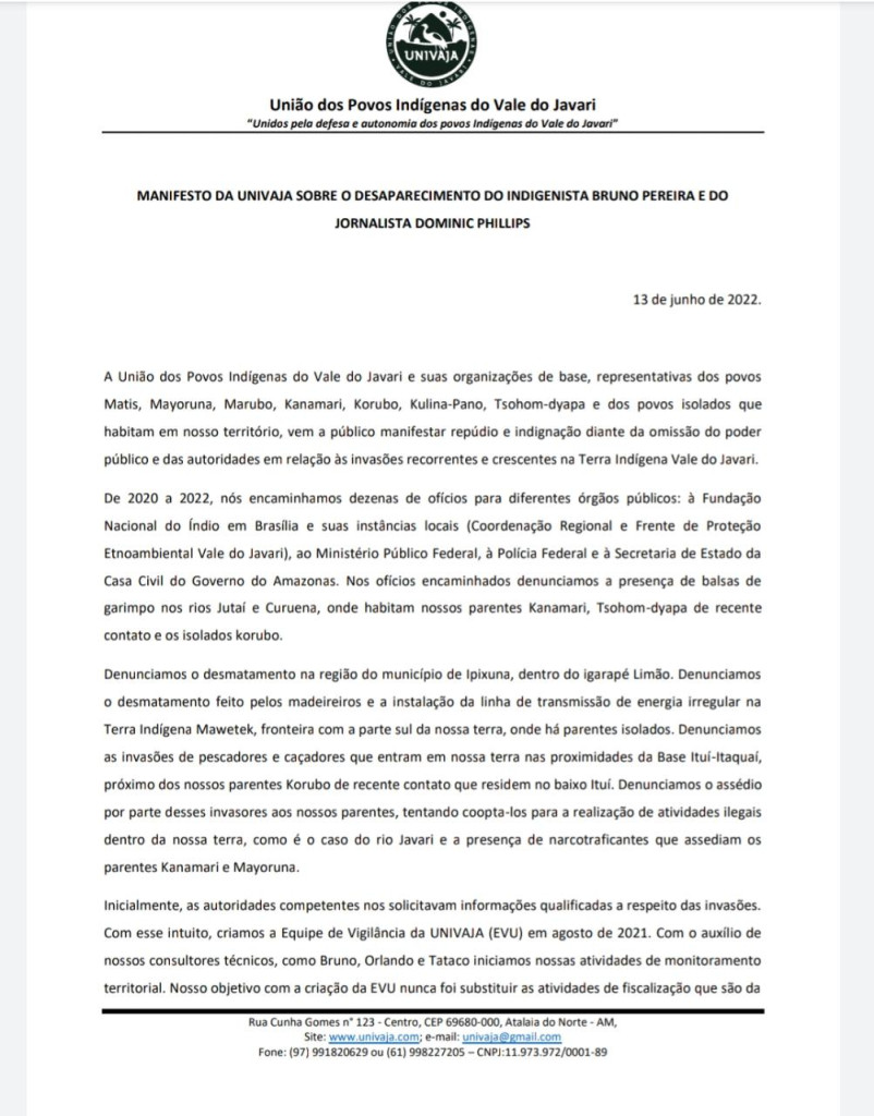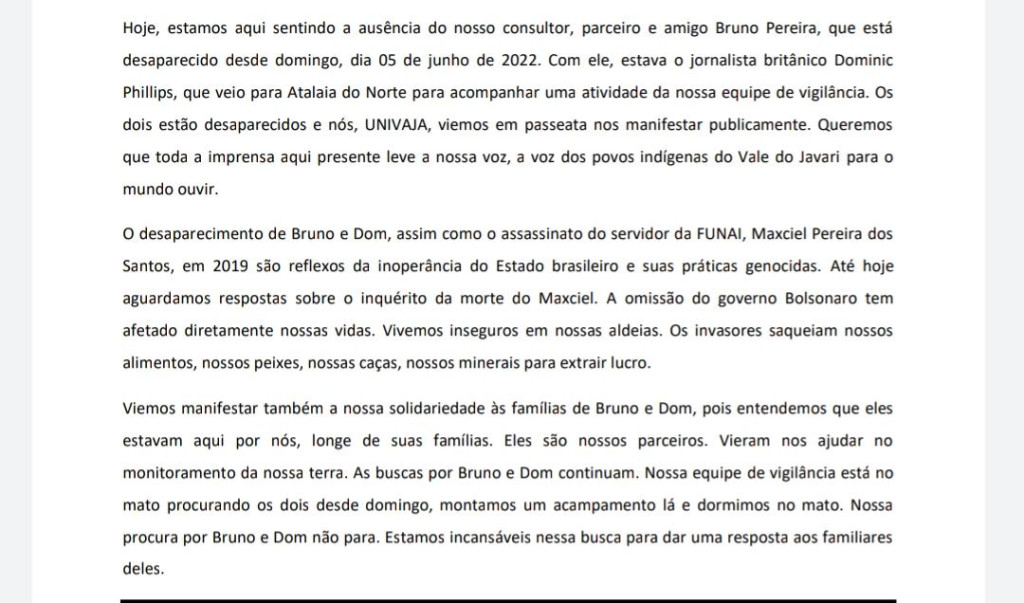 A União dos Povos Indígenas manifesta também solidariedade às famílias de Bruno e Dom. “Hoje, estamos aqui sentindo a ausência do nosso consultor, parceiro e amigo Bruno Pereira, que está desaparecido desde domingo, 5 de junho de 2022. Com ele, estava o jornalista britânico Dominic Phillips, que veio para Atalaia do Norte para acompanhar uma atividade da nossa equipe de vigilância (…) entendemos que eles estavam aqui por nós, longe de suas famílias. Eles são nossos parceiros. Vieram nos ajudar no monitoramento da nossa terra“, afirma a Univaja.