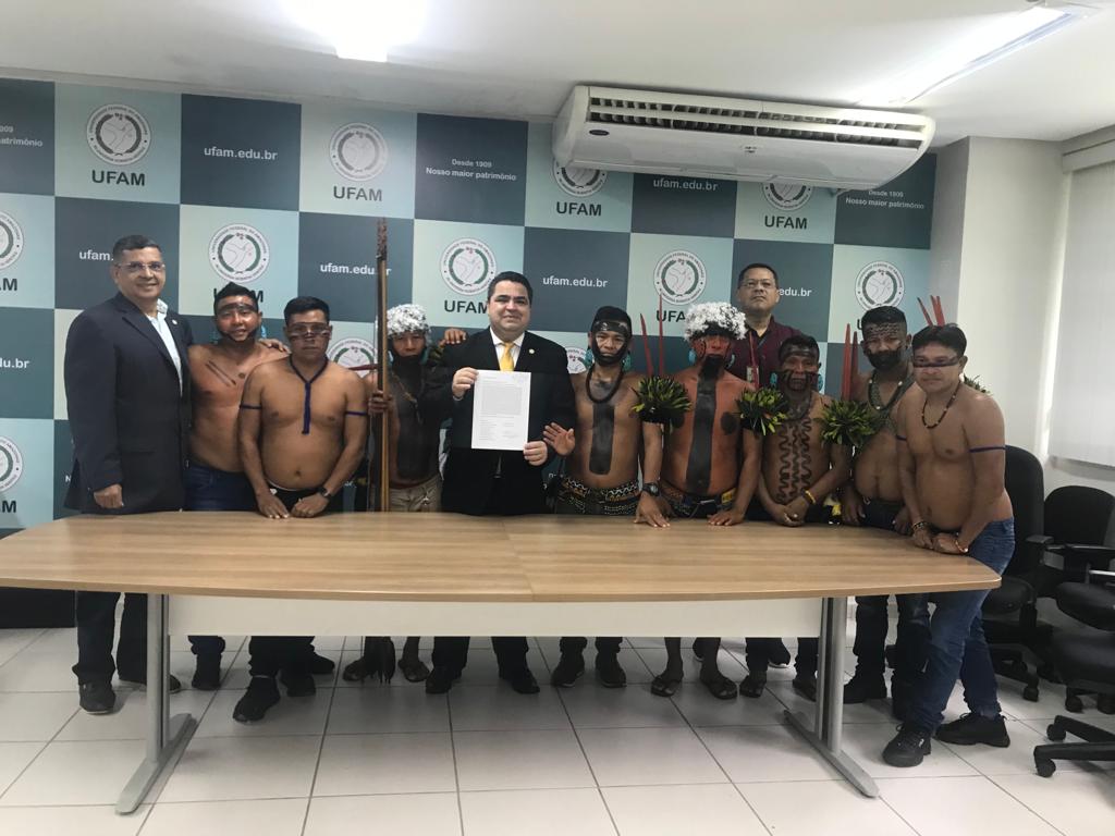 Também presente na reunião, o pró-reitor de Ensino de Graduação, professor David Lopes Neto, recebeu, juntamente com reitor Sylvio Puga, um documento fruto do debate de 11 comunidades do povo Yanomami do Alto Rio Negro para que a instituição se instale na região.