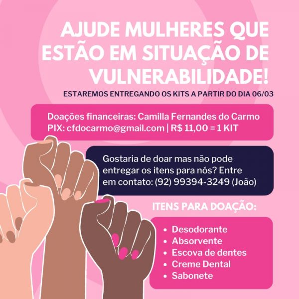 MANAUS- Um grupo de amigos se reuniu para levar doações dos kits de higiene a mulheres em situação de rua e para as que residem em comunidades mais pobres. A iniciativa é em parceria com alguns estabelecimentos comerciais e com o Grupo Solidariedade. A ação conta com a ajuda de discentes da UEA e a meta é ajudar no mínimo 100 mulheres que estejam precisando dos itens.