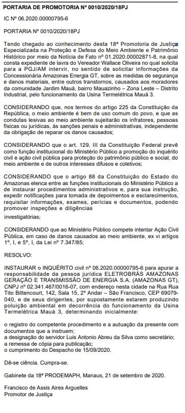 A portaria da investigação foi publicada no Diário Oficial do órgão e assinada pelo promotor de Justiça Francisco Arguelles. De acordo com o documento, o caso foi denunciado pelo vereador Wallace Oliveira (Pros), da Câmara Municipal de Manaus (CMM) e chegou ao conhecimento da 18ª promotoria de Justiça Especializada na Proteção e Defesa do Meio Ambiente e Patrimônio Histórico, por meio da notícia de fato nº 01.2020.00002871-8.