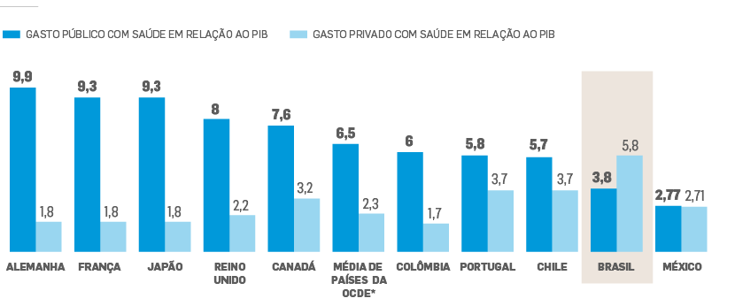No Brasil, o índice geral de investimento na saúde não é baixo – cerca de 9,6% do PIB –, mas a divisão dos gastos públicos e privados está muito aquém dos países desenvolvidos. No Reino Unido, por exemplo, onde há um amplo sistema público, a fatia privada representa 2,2% dos recursos, enquanto no Brasil esse índice é de 5,9%.