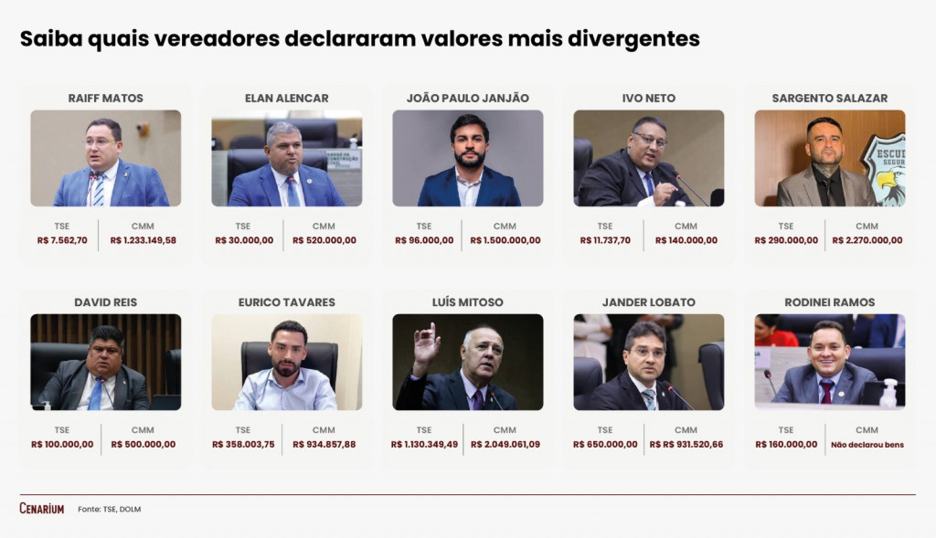 MANAUS (AM) – Dos 41 vereadores eleitos e reeleitos para a 19ª Legislatura da Câmara Municipal de Manaus (CMM), dez parlamentares se destacaram ao registrar divergências significativas em valores nas declarações de bens no Diário Oficial do Legislativo Municipal (DOLM), em comparação ao que haviam declarado no Tribunal Superior Eleitoral (TSE) no momento da candidatura.
