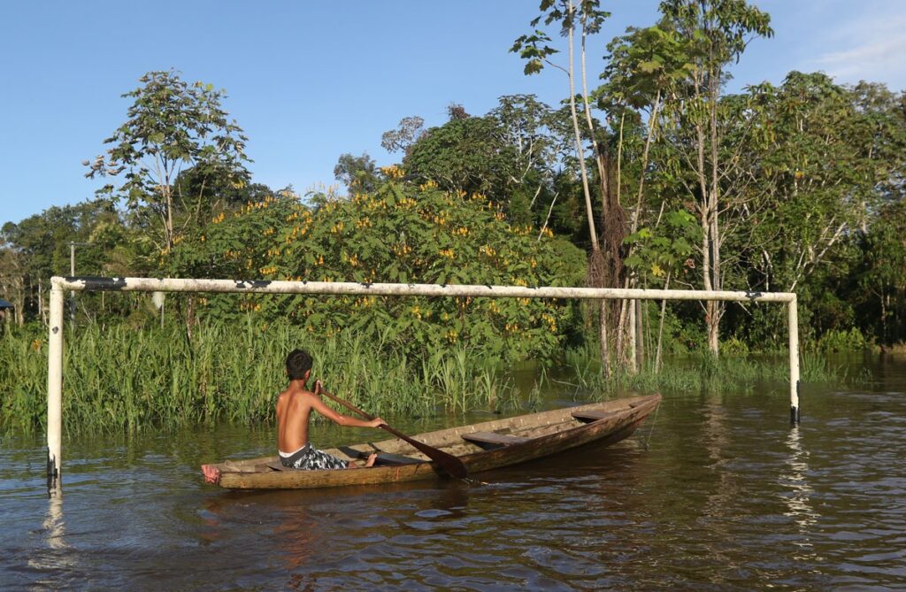 Como dito, não tem uma área na cidade que escape das águas do Solimões. Espaços para prática de esportes, como quadras poliesportivas e campos de futebol agora mais parecem lagos. Para se ter noção do nível que a cheia atinge, a água está quase cobrindo as traves de um campo de futebol completamente. O que antes servia para fazer gols, hoje é apenas um detalhe na imensidão de água.