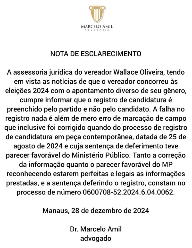 Por meio de nota, a assessoria jurídica do vereado Wallace Oliveira informou à CENARIUM que o registro de candidatura é preenchido pelo partido e não pelo candidato. Também informou que a falha do registro nada é além de mero erro de marcação de campo.