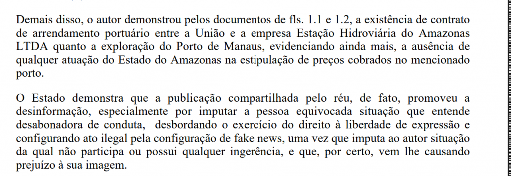 “O autor demonstrou pelos documentos de fls. 1.1 e 1.2, a existência de contrato de arrendamento portuário entre a União e a empresa Estação Hidroviária do Amazonas LTDA quanto a exploração do Porto de Manaus, evidenciando ainda mais, a ausência de qualquer atuação do Estado do Amazonas na estipulação de preços cobrados no mencionado porto. O Estado demonstra que a publicação compartilhada pelo réu, de fato, promoveu a desinformação”, diz trecho da decisão judicial.