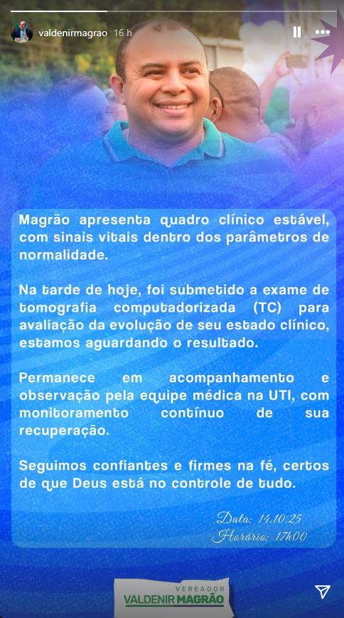 O último boletim médico, divulgado pela família no perfil do vereador no Instagram, nessa terça-feira, 14, informava que o quadro clínico de Magrão era “estável, com sinais vitais dentro dos parâmetros de normalidade”. A notícia da morte causou comoção entre familiares, amigos e colegas de trabalho, que vinham acompanhando o caso e torcendo pela recuperação do político.