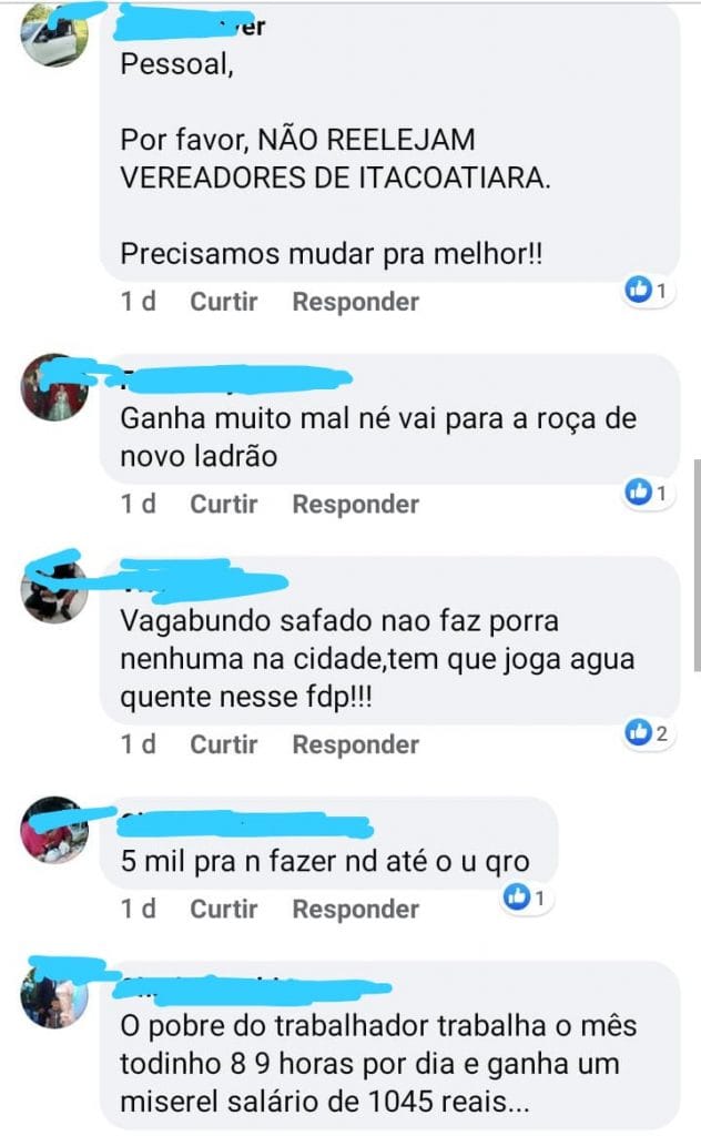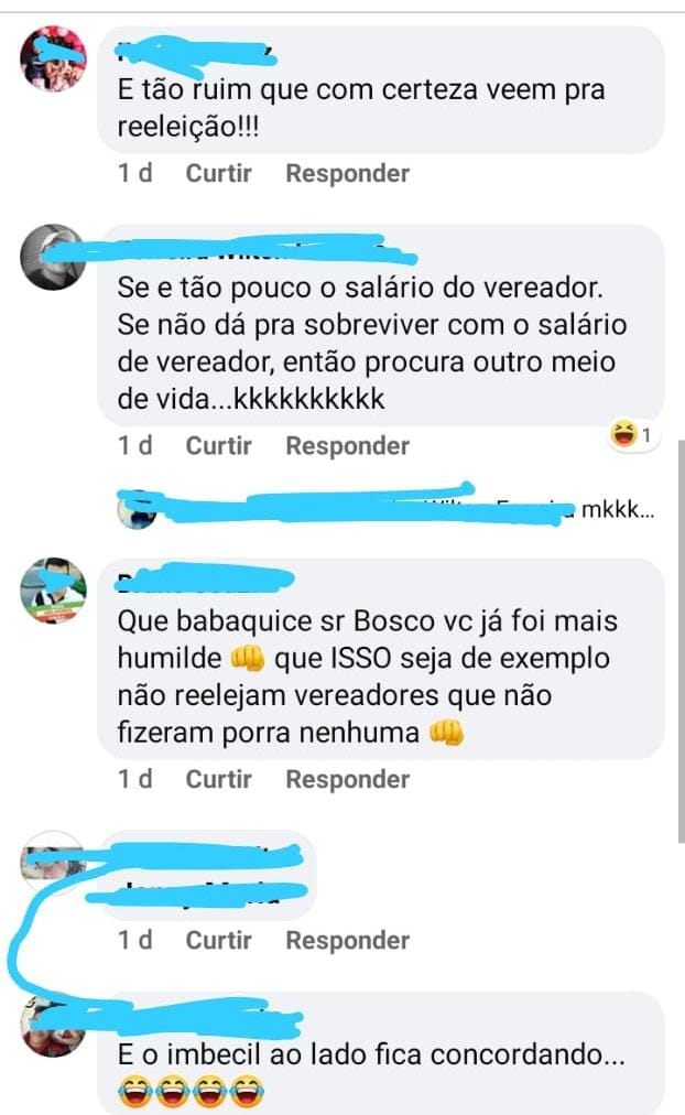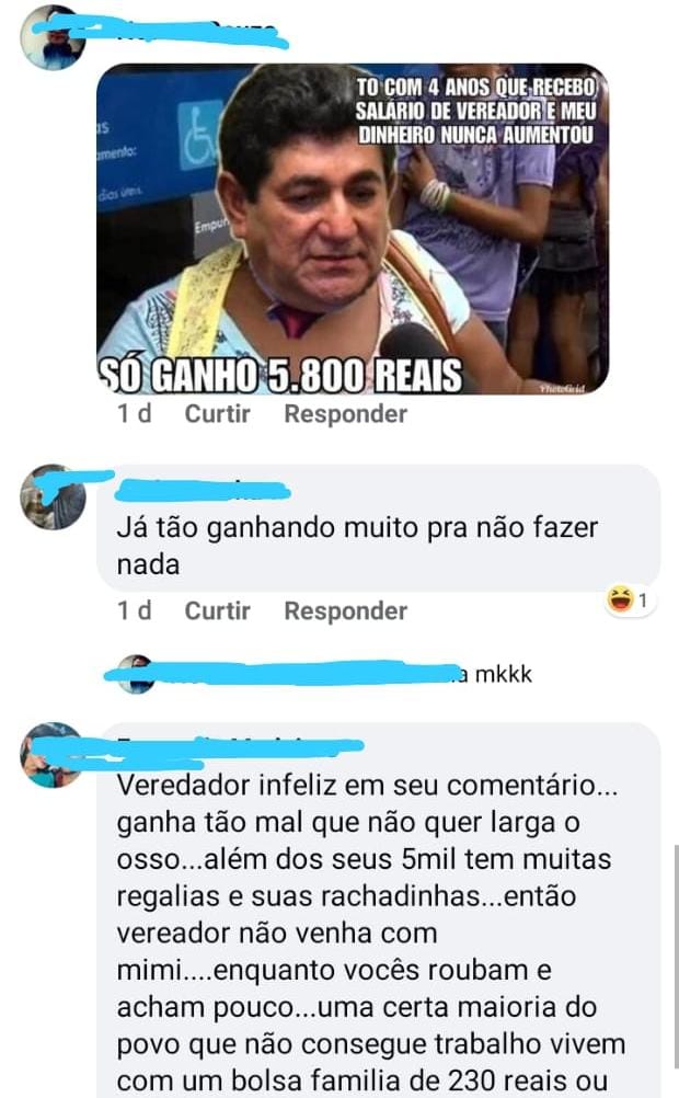 “É tão ruim que com certeza vem para reeleição”, diz um homem. Outras pessoas chegam a usar palavras de baixo calão para se referir ao vereador. “Vereador infeliz em seu comentário. Ganha tão mal que não quer largar o osso, além dos seus R$ 5 mil, tem muitas regalias”, pontua uma mulher.