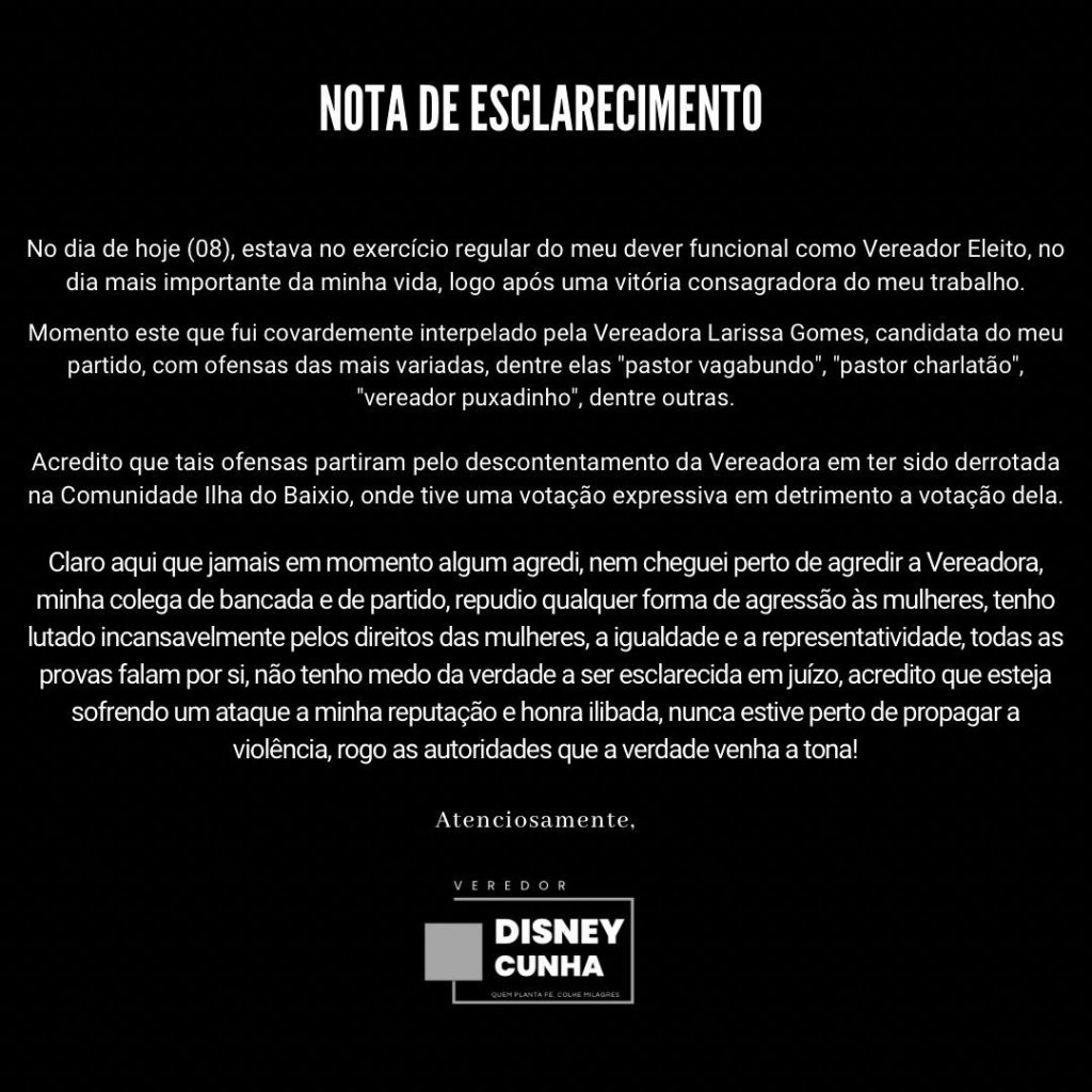Disney também diz ter sido ofendido por Larissa com palavras como “pastor vagabundo”, “pastor charlatão”, entre outras. A assessoria de Larissa, por sua vez, afirmou que a nota é “mentirosa”.