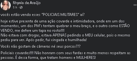 “(Eu) Não estava com drogas, estava apenas pedindo o meu celular, pois o mesmo pediu para ver. Após pedir, fui xingada e humilhada”, contou a jovem, em uma publicação nas redes sociais.
