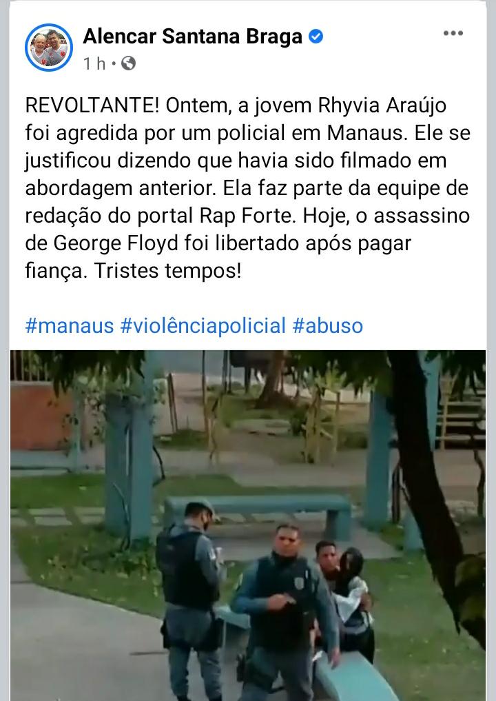 “Revoltante! Ontem, a jovem Rhyvia Araújo foi agredida por um policial em Manaus. Ele se justificou dizendo que havia sido filmado em abordagem anterior”, relembrou o deputado.
