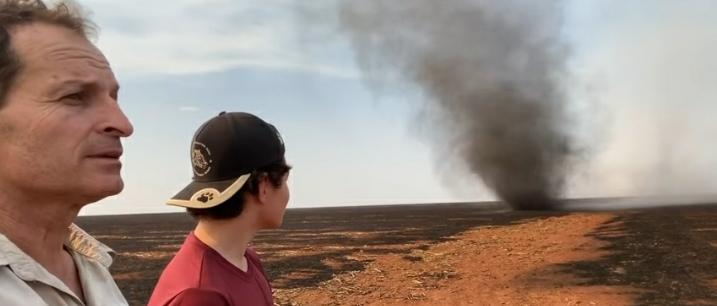 Nas imagens publicadas pelo biólogo Leandro Silveira, 50, um dos coordenadores do instituto que tem o objetivo de preservar e estudar o maior felino das Américas, é possível observar a formação da ventania em uma área de pastagem seca, atingida pelo fogo.