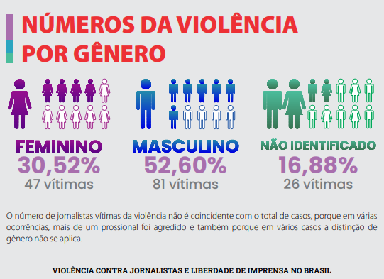 Os dados da Fenaj de 2024 mantêm a maioria dos ataques contra jornalistas do sexo masculino, mas ressalta que a diferença percentual diminuiu em relação aos anos anteriores. “Em 2023, 68,32% das vítimas eram do sexo masculino, 25,19% do sexo feminino, e em 6,49% não foi possível identificar o gênero. Em 2024, foram registradas 81 vítimas do sexo masculino, 47 do sexo feminino, e 26 casos configurados como ataques coletivos ou contra profissionais de maneira genérica em uma determinada mídia. Ao todo, foram computados 154 casos”, informa a Fenaj.
