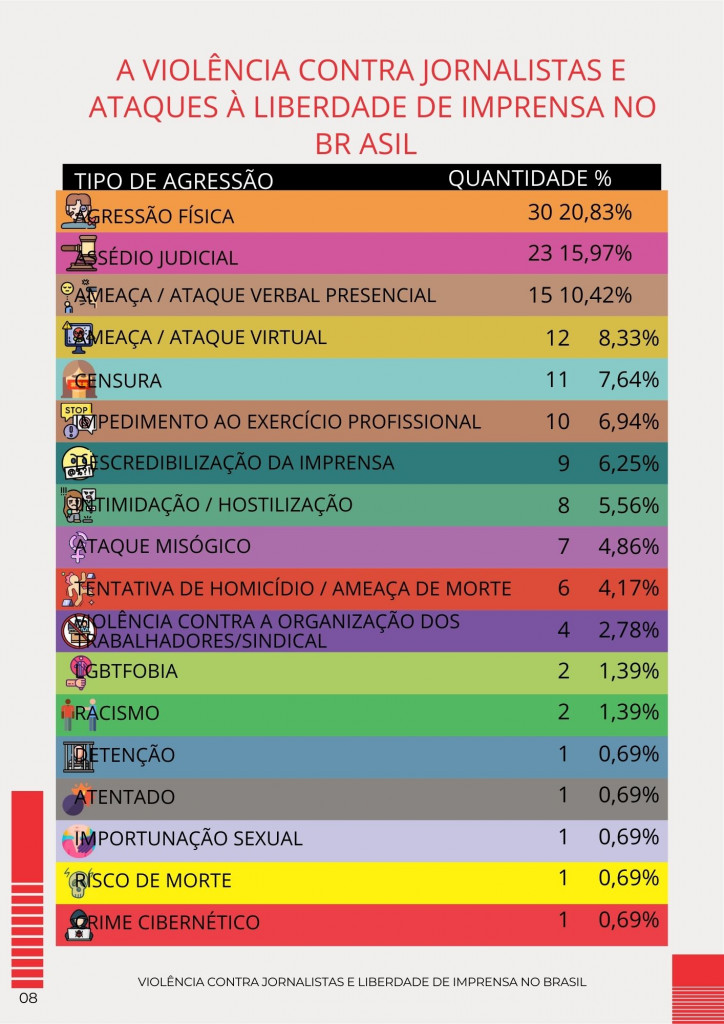 A agressão física lidera o número de ocorrências (30), alcançando 20,83% do total. Em seguida está o assédio judicial, que consiste no abuso de mecanismos jurídicos com a intenção de coibir ou intimidar o trabalho jornalístico, com 23 registros, ou 15,97%. Em terceiro, vem a ameaça ou ataque verbal presencial (15), o que corresponde a 10,42% dos casos.
