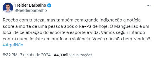 Nas redes sociais, o governador do Pará, Helder Barbalho (MDB), se pronunciou sobre a violência. O chefe do Executivo paraense destacou que o Mangueirão é um “local de celebração do esporte e esporte é vida” e prometeu ações de combate à violência.