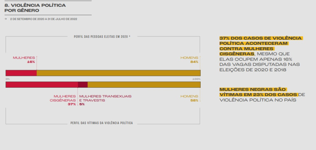 De acordo com o levantamento, “parlamentares negros, mulheres, LGBTQIAP+ e defensores dos direitos humanos são as vítimas que mais sofrem com a violência política e eleitoral de forma reincidente“. Além disso, o relatório mostra que 37% dos casos de violência política ocorreram contra mulheres cisgêneras, indivíduo que se identifica com o sexo biológico com o qual nasceu, ainda que elas representem 16% das pessoas eleitas em 2018 e 2020. Já as mulheres negras integram 23% dos casos de violência no País.