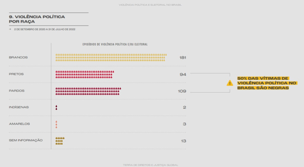 O relatório mostra que, de 2 de setembro de 2020 a 31 de julho deste ano, foram 181 casos envolvendo brancos, o que equivale a 45%. Amarelos e indígenas somam 5 casos que foram mapeados a “partir do monitoramento de notícias nas plataformas de busca da internet e nas redes sociais e sendo considerados apenas os casos em que houve participação direta de agentes político-institucionais ou de lideranças partidárias.