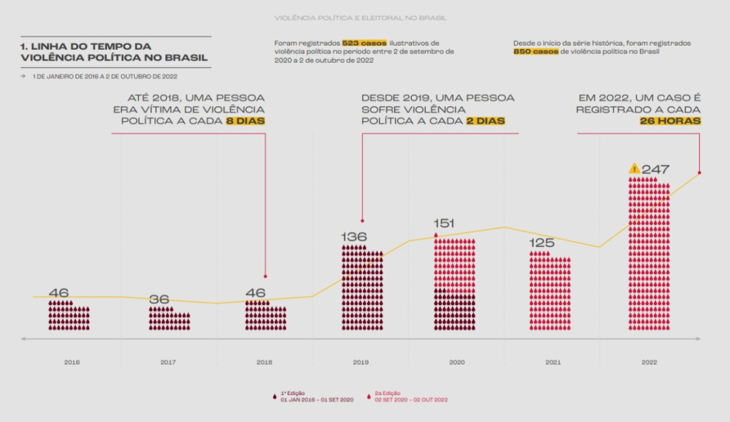 O “Violência política e eleitoral no Brasil” é uma continuação de um levantamento iniciado em 2020, que analisa os episódios de violência política desde 2016. Segundo o documento, desde o início da atividade foram registrados 850 casos de violência política no Brasil.