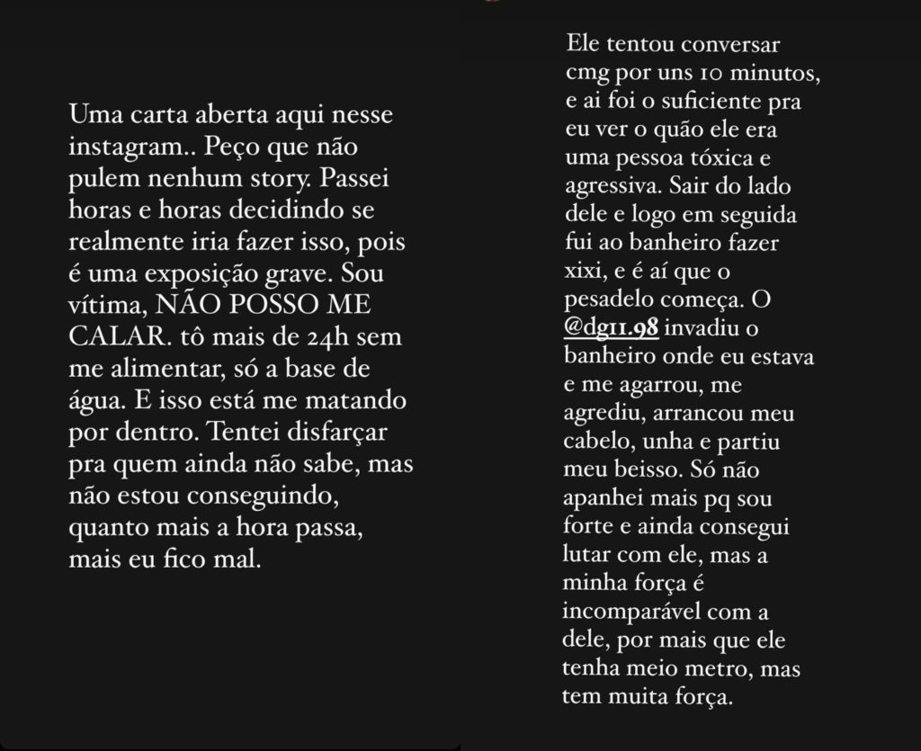 “Decidi por horas se faria isso, pois é uma exposição grave. Mas sou vítima, não posso me calar. Estou há mais de 24 horas sem me alimentar, só à base de água, e isso está me matando por dentro. Na madrugada de sexta para sábado, esse monstro [Douglas Santos] queria ficar comigo à força. Acreditem, uma pessoa que pega um fora e continua pressionando quer ficar à força, sim“, relata Lígia no Instagram.