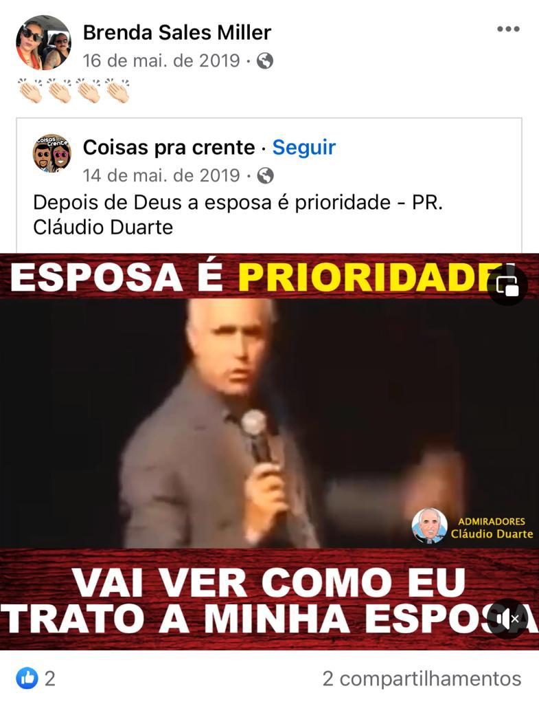 Uma das publicações, compartilhada em maio de 2019, foi um vídeo do pastor Cláudio Duarte, famoso por seu jeito descontraído de abordar assuntos religiosos e sobre o matrimônio. No conteúdo, ele critica homens que não valorizam as esposas e os aconselha a aprender a colocar as companheiras como prioridade. “Primeiro é Deus, depois a minha mulher, depois a minha família, depois a minha igreja“, diz Duarte, lembrando ainda que as mulheres devem ser tratadas com gentileza. Brenda reagiu com palmas à publicação.