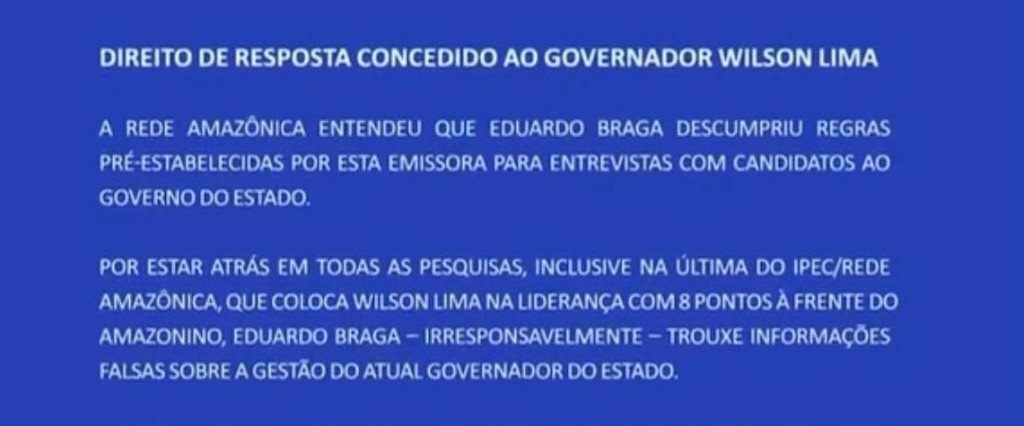 “A Rede Amazônica entendeu que Eduardo Braga descumpriu regras preestabelecidas por esta emissora para entrevistas com candidatos ao Governo do Estado. Por estar atrás em todas as pesquisas, inclusive, na última do Ipec/Rede Amazônica, que coloca Wilson Lima na liderança, com 8 pontos, à frente de Amazonino, Eduardo Braga,- irresponsavelmente – trouxe informações falsas sobre a gestão atual do governador do Estado”, informa um trecho da nota lida durante o jornal.