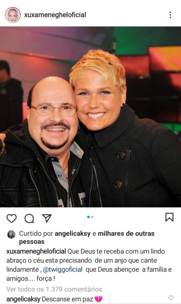 A apresentadora Xuxa Meneghel escreveu uma mensagem aos amigos e familiares do artista. “Que Deus te receba com um lindo abraço. O céu está precisando de um anjo que cante lindamente, @twiggoficial que Deus abençoe a família e amigos… força!”, escreveu Xuxa.