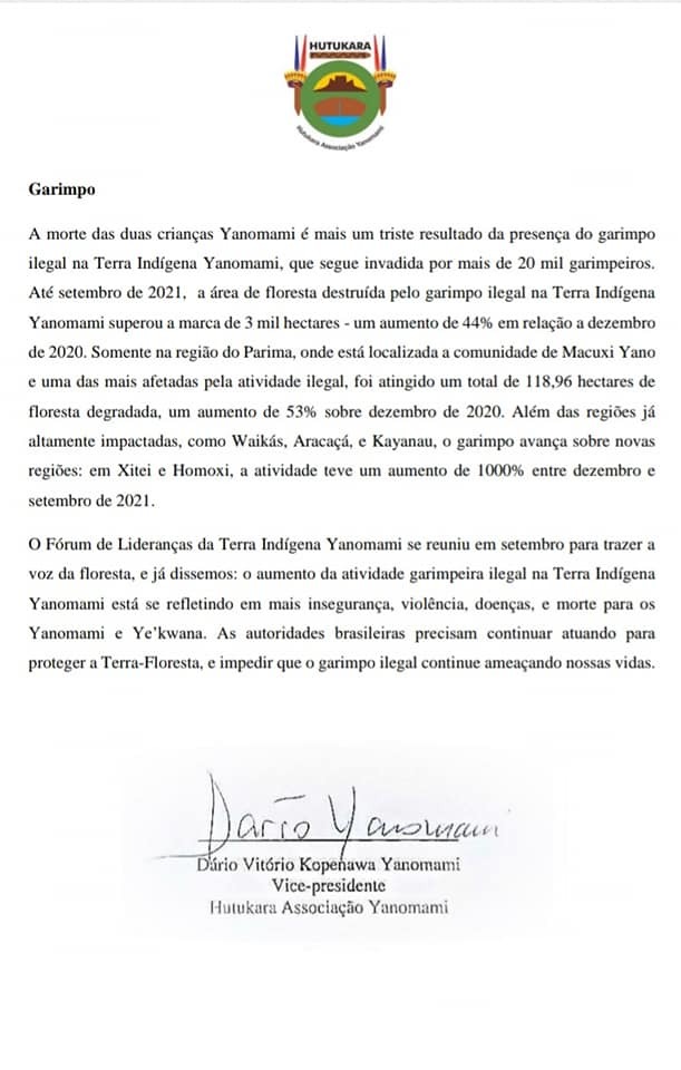 “A morte das duas crianças Yanomami é mais um triste resultado da presença do garimpo ilegal em Terra Indígena Yanomami, que segue invadida por mais de 20 mil garimpeiros(…) As autoridades brasileiras precisam continuar atuando para proteger a Terra-Floresta e impedir que o garimpo ilegal continue ameaçando nossas vidas”, apela a associação no texto.