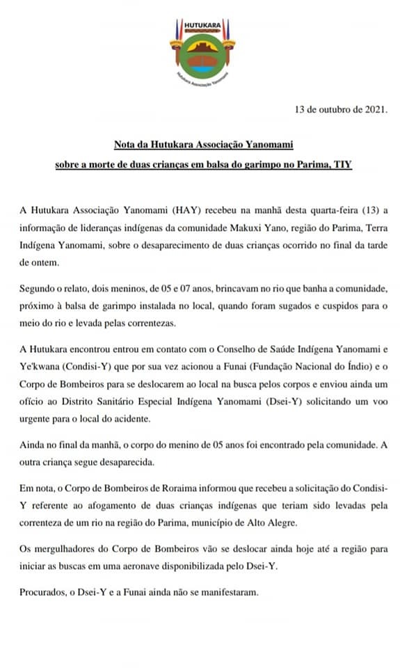 Na manhã desta quarta-feira, 13, a comunidade encontrou o corpo da criança de 5 anos já sem vida, porém, o outro menino continua desaparecido. Ainda em nota, a Hutukara lamentou a morte da criança e alertou, mais uma vez, quanto ao perigo, violência, doenças e mortes causadas pelas atividades garimpeiras ilegais na TI.
