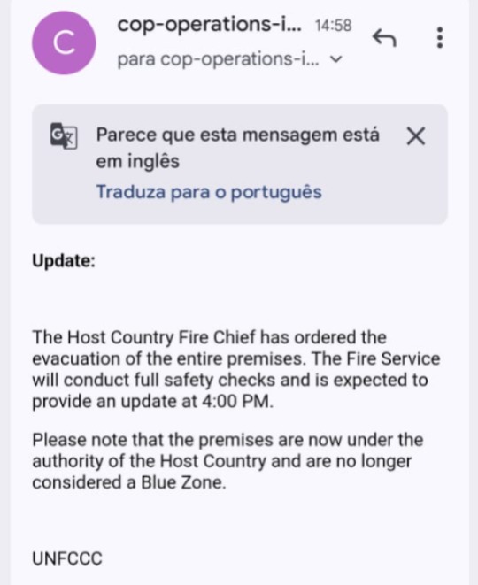 Em comunicado posterior, a UNFCCC reiterou que, após a evacuação e a atuação dos bombeiros, o espaço deixa oficialmente de integrar a Zona Azul sob responsabilidade da ONU. “As instalações agora estão sob a autoridade do País anfitrião e não são mais consideradas uma Zona Azul”, informou a entidade.