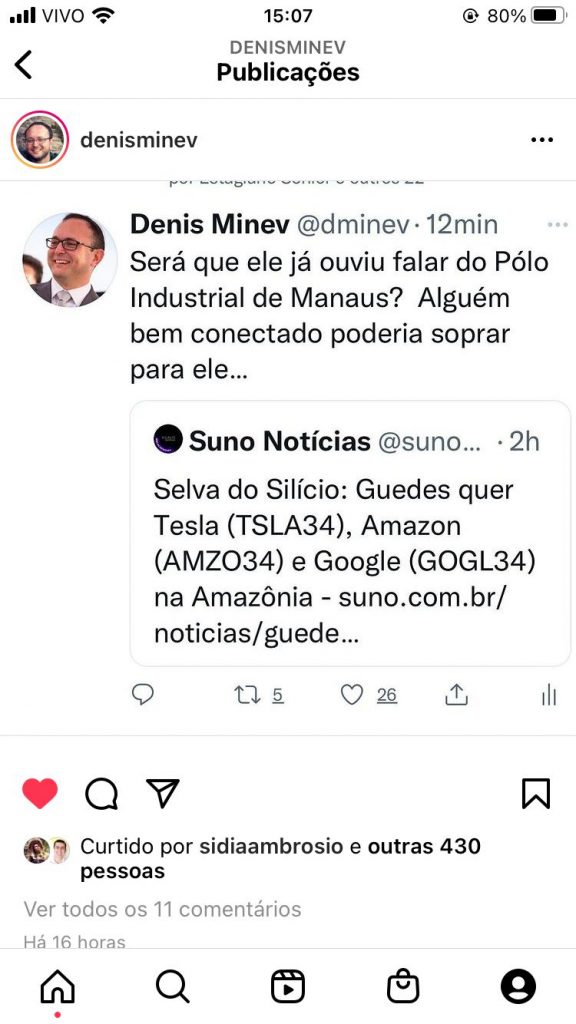 “Será que ele já ouviu falar do Polo Industrial de Manaus? Alguém bem conectado poderia soprar para ele?”, escreveu Denis Minev, no Instagram, ao compartilhar uma notícia sobre a “Selva do Silício”.