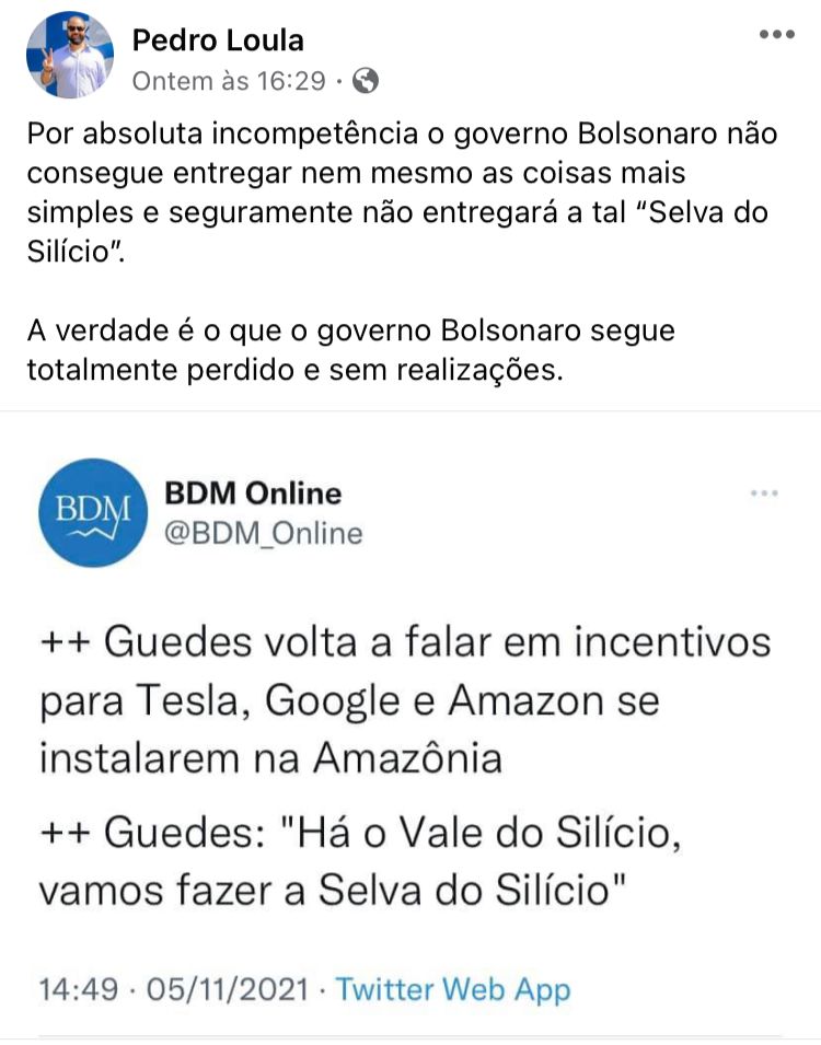 “Por absoluta incompetência, o governo Bolsonaro não consegue entregar nem mesmo as coisas mais simples e, seguramente, não entregará a tal “Selva do Silício”. A verdade é que o governo Bolsonaro segue totalmente perdido e sem realizações”, declarou, no Facebook.