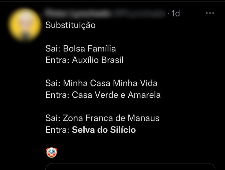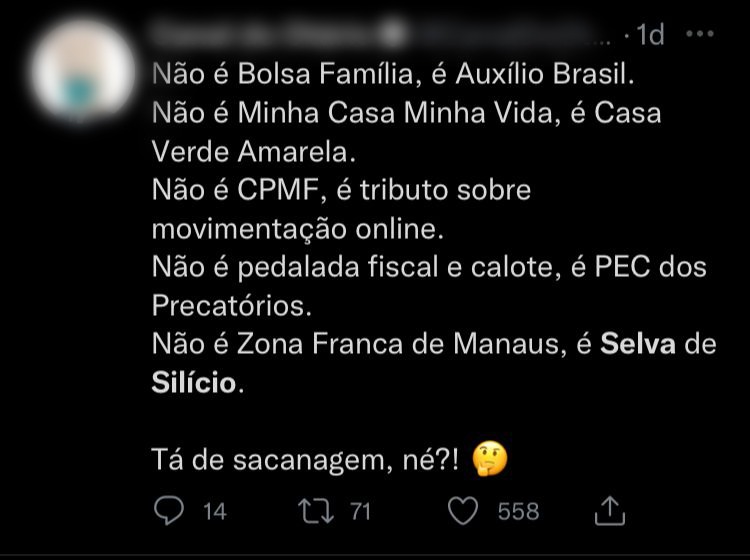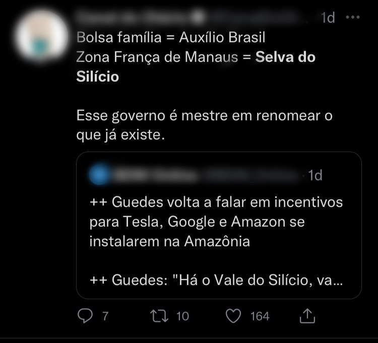 “Bolsa Família = Auxílio Brasil. Zona Franca de Manaus = Selva do Silício. Esse governo é mestre em renomear o que já existe”, criticou uma pessoa, em uma publicação no Twitter.